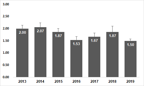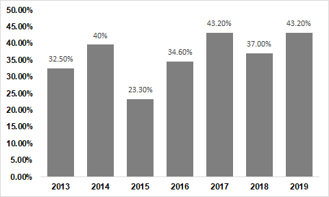 일단 보여드리는 것은 13년부터 19년까지의 필기 합격률입니다.