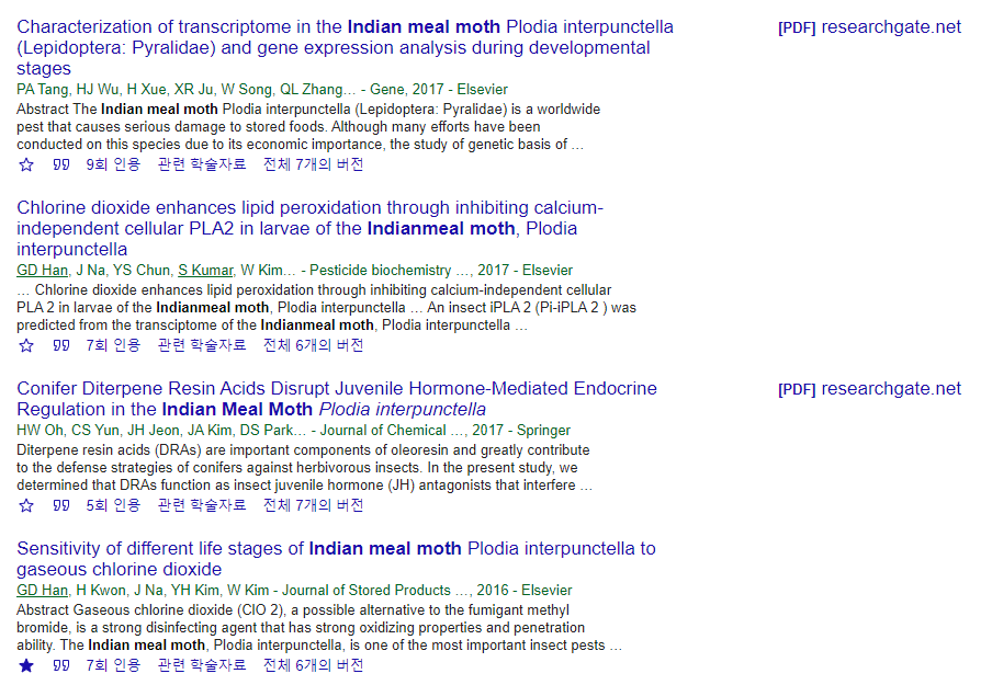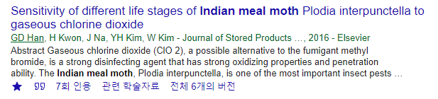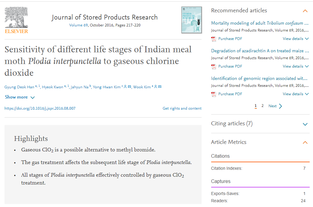 라는 제목의 논문으로 우리가 이용할 chlorine dioxide 와 Indian meal moth 모두를 재료로 한 논문인 것 같다. 검색창에 나온 것을 기준으로 이 논문의 정보를 확인해 보자.