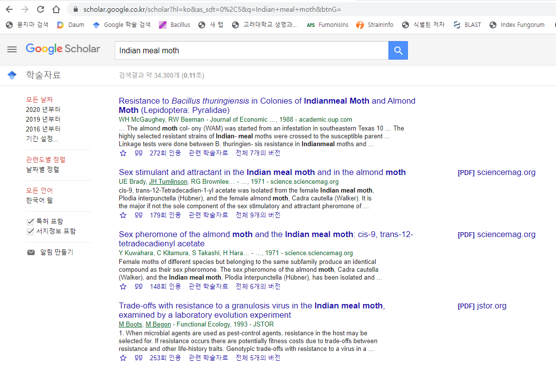 우리는 이번에 화랑곡나방 유충이 chlorine dioxide 처리에 대해서 반응하는 것이 대한 논문을 작성할 계획이다. 모든 데이터는 가상의 학생들이 만들었으며, 실제 데이터를 기반으로 한 가상의 데이터다. 이 데이터를 다루기 위해서는 화랑곡나방에 대한 기본 지식과 여러가지 잡다한 자료들이 필요하다. 화랑곡나방은 영어로 Indian meal moth 이고 학명은 Plodia interpunctella (학명은 반드시 이텔릭체로 쓴다.)이다. 이를 이용하여 검색을 해 보자. 검색창에 Indian meal moth를 적고 엔터를 친다.