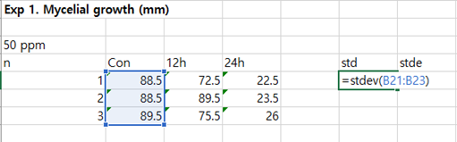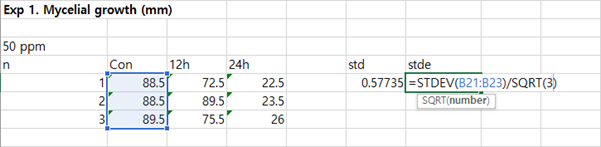 다음과 같이 구하면 된다. 표준편차와 표준오차를 비교해 보면 표준오차가 더 작은 값을 나타내는 것을 볼 수 있다. 이는 반복수가 많을수록 더 작아지는 값이다. 그러므로 이 값은 논문을 읽는 사람에게 이 실험이 얼마나 정밀하게, 많은 반복수를 가지고 했는지를 알려줄 수 있는 값이다.