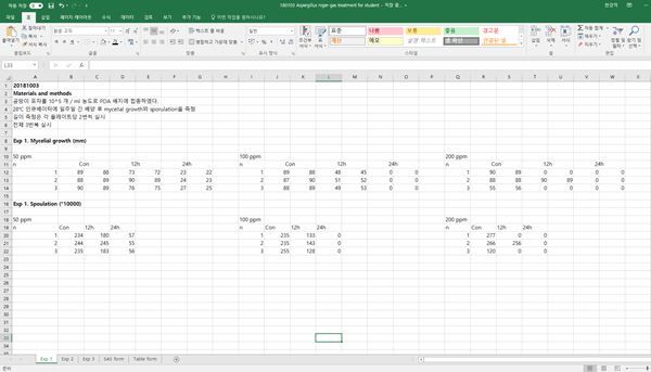 가장 위에 제목을 보자, 파일 제목을 180103으로 이 데이터가 작성된 시작된 날짜는 180103 임을 알 수 있다. 그리고 실험 내용은 Aspergillus niger-gas treatment 로 곰팡이를 가스처리 했다는 내용이다. 가장 아래를 보자, 이 파일에는 EXP1, EXP2, EXP3 그리고 SAS로 정리한 모양과 테이블을 그리기 위해 정리한 데이터가 들어 있는 파일이다. 파일 내용을 이제 읽어 보자. 가장 위에는 이 실험을 시작한 날짜가 들어간다. 이 실험을 시작한 날짜는 20180103이다. 그 아래에 Materials and methods 가 있다. 실험을 어떤 방법으로 했는지 나와 있다. 여기서는 곰팡이를 어떤 농도로 어느 배지에 어떤 온도에서 어디에 배양했는지 얼마나 배양했는지 설명해 주고 있다. 또한, 어떤 데이터를 얻었는지 알려주고 있다. 그리고 반복수도 알려주고 있다. 이렇게 최대한 자세히 자신이 한 실험의 내용을 적어야만 한다. 쓰기 편하게 한글로 적어도 되고, 최종적으로 논문을 작성할 생각을 하고 영어로 작성을 해도 된다. 그 아래에는 이 실험이 몇 번째 데이터이며 어느 측정치의 결과인지와 단위가 쓰여 있고, 어떤 처리를 하였는지도 적혀 있다. 이와 같이 Raw 데이터 파일을 정리해야만 한다. 그런데..
