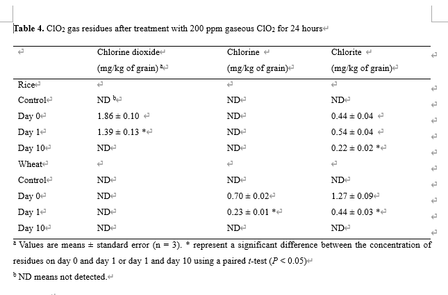 4. Table 1 (Figure 1) shows the mortality of 5 instar P. interpunctella treated with 50 ppm of gaseous ClO2.