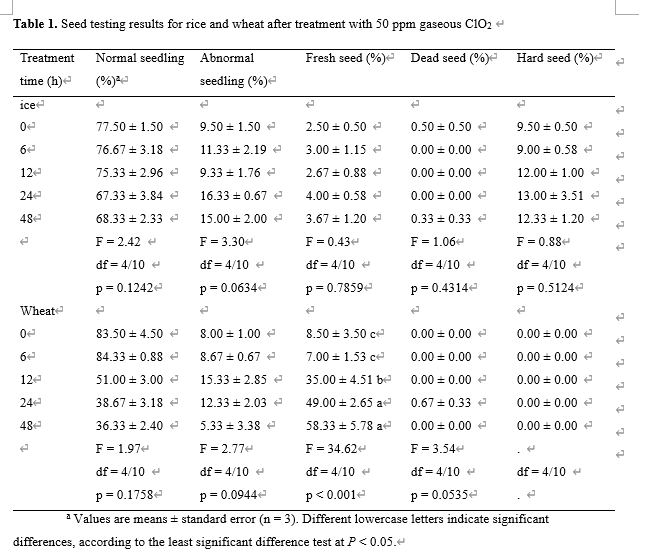 6. Table 1 indicates that the mortality of 5 instar P. interpunctella treated with 50 ppm of gaseous ClO2.